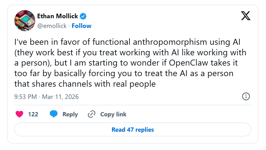 TL;DR: Wharton professor Ethan Mollick said he supports treating AI like collaborators but questioned whether OpenClaw goes too far by placing AI agents in shared communication channels alongside humans. He suggested the design may blur the boundary between people and software, sparking debate online about anthropomorphism, accountability, and how human-AI collaboration should appear in everyday workflows.