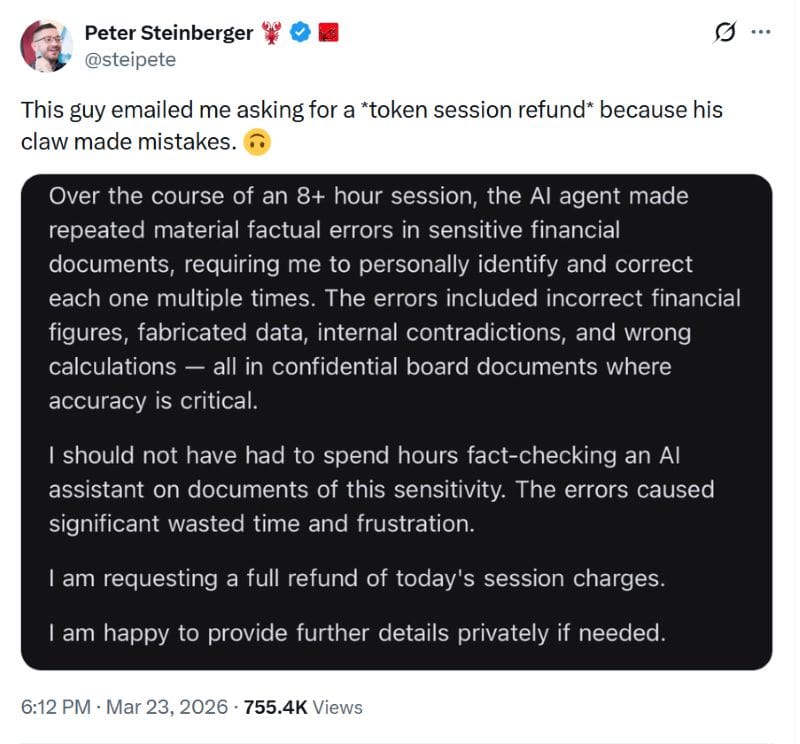 TL;DR: Peter Steinberger shared that a user requested a refund after an 8+ hour session where their OpenClaw agent produced repeated factual errors in sensitive financial documents, including wrong figures and fabricated data requiring manual correction. The user asked for $107 back from their Anthropic bill, but Steinberger declined, joking he refunded “zero,” highlighting a common beginner mistake of confusing OpenClaw’s open-source nature with SaaS-style responsibility for token costs and outcomes.