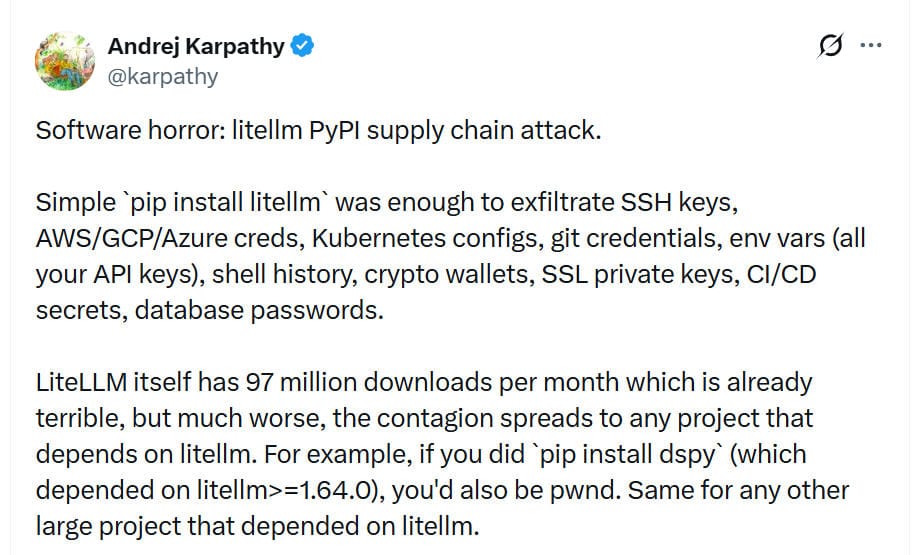 TL;DR: Ai pioneer Andrej Karpathy reported that a compromised LiteLLM version (1.82.8) was briefly published on PyPI, where a simple pip install litellm triggered malware that exfiltrated SSH keys, cloud credentials, API keys, and more. Because LiteLLM is widely used and embedded in dependencies like dspy—and also present in OpenClaw environments—the attack spread downstream. It was live for under an hour before crashes exposed it.