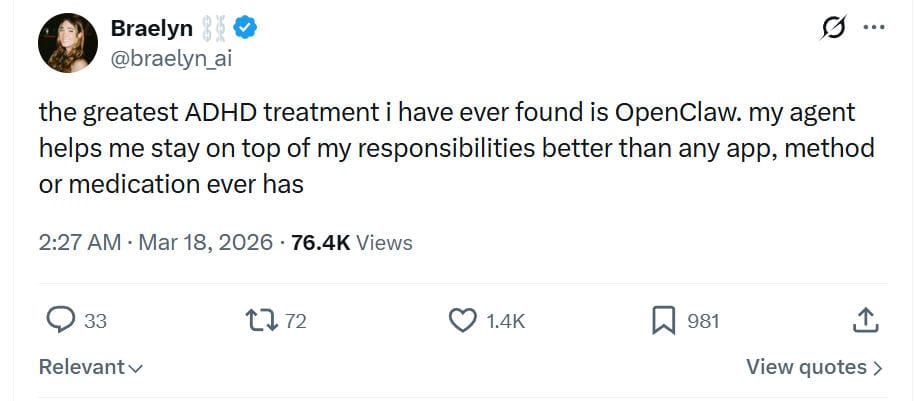 TL;DR: A developer shared that he uses OpenClaw as a personal agent to manage ADHD by creating structured to-do lists with reminders and context, and asking the agent for priorities at any time. Unlike static lists, the system is interactive, prompting decisions on whether to continue or drop tasks, helping them stay organized and follow through.