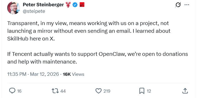 TL;DR: OpenClaw creator Peter Steinberger criticized Tencent after discovering on X that the company had launched “SkillHub,” a platform mirroring all skills from ClawHub. Steinberger said transparency would have meant contacting the project first, not quietly launching a mirror. Tencent replied that SkillHub is a localized mirror for Chinese users and credited the original source.