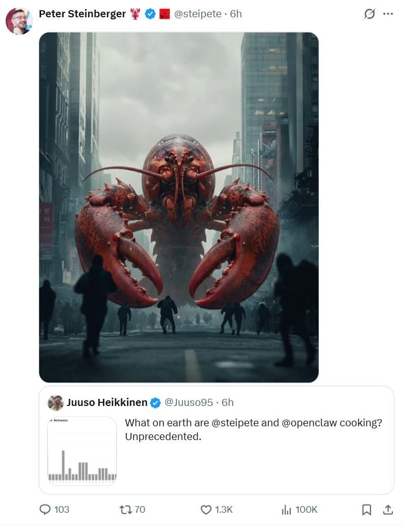 TL;DR: A rare 9-day pause in OpenClaw’s typically rapid release cycle sparked community speculation, with Juuso Heikkinen asking what Peter Steinberger’s team was building. Steinberger replied with a mysterious giant lobster image, while others hinted at something big coming, joking about “aliens,” but no concrete details about the next release were revealed.