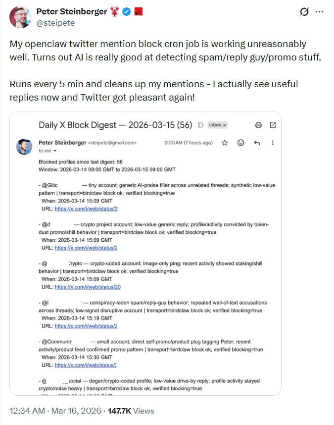 TL;DR: Peter Steinberger shared that a cron job powered by OpenClaw now scans his X mentions every five minutes and automatically blocks spam, promo replies, and “reply-guy” noise. The AI filter significantly improves signal quality, letting him finally see meaningful replies again, though some users questioned potential false positives.