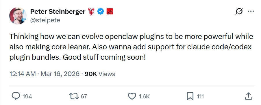 TL;DR: Peter Steinberger said he is redesigning the plugin architecture of OpenClaw to make plugins more powerful while keeping the core lightweight. He also plans to support plugin bundles compatible with Claude Code and Codex ecosystems. Developers welcomed the move, discussing bundle formats and distribution, while Steinberger emphasized keeping OpenClaw open-source rather than turning it into a paid marketplace.