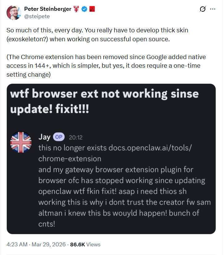 TL;DR: Peter Steinberger explained that OpenClaw’s Chrome extension was removed after Google introduced native browser access in Chrome 144+, which simplifies the setup but requires a one-time configuration change. The update led to confusion and complaints from users who found their previous setup no longer working, surfacing directly through ongoing discussions in the OpenClaw Discord.
