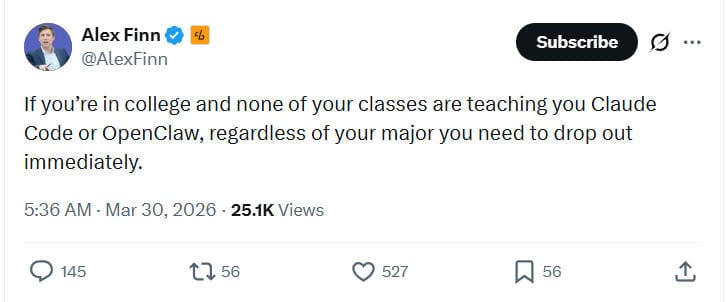 TL;DR: Alex Finn argued that college students should drop out if schools aren’t teaching them tools like Claude Code or OpenClaw, arguing these are essential for economic relevance today. His post sparked debate, with critics noting universities don’t yet offer such courses and others arguing college still provides networking, credentials, and adaptability beyond rapidly changing AI tools.