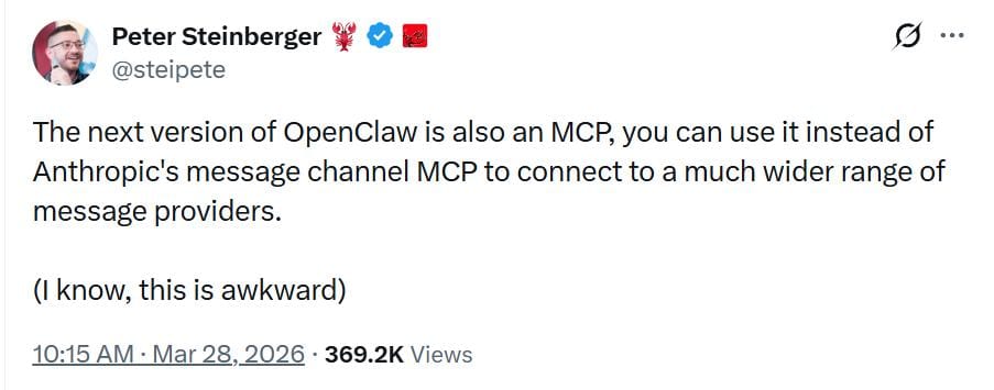 TL;DR: Peter Steinberger revealed that the next version of OpenClaw will itself act as an MCP, replacing Anthropic’s message channel MCP and enabling connections to a wider range of messaging providers. He confirmed support will extend across platforms like MS Teams, Matrix, and WhatsApp, using a notification protocol extension to handle interactions and replies.