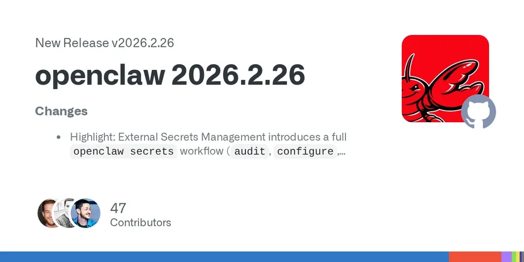 TL;DR: OpenClaw v2026.2.26 adds external secrets management, promotes ACP thread-bound agents to a first-class runtime, and moves Codex to a WebSocket-first transport. It also improves the Android app, introduces agent routing CLI controls, and ships 11 security hardening fixes.